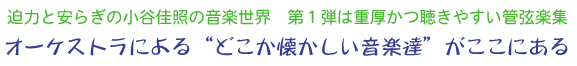 2000〜2004年に作曲された楽曲を収録。特にメロディアスな作品を集めた作品集である。作者の音楽はとても叙情的で絵画的である。純音楽を基礎としてシンセサイザーや和音が織り込まれているその音色は、切なくもあり、懐かしく、柔らかく、そして暖かい。心にフッと風景を浮かばせてしまう作者の音色は「心で聴く」という言葉がふさわしい。楽曲の一部を紹介してみよう。TOMIYAMA SYMPHONYは作者に所縁のある島根県の富山町という緑豊かで穏やかな景色に包まれた地方を、明け方から昼、昼から夕暮れ、夜、と時間を追って三楽章形式で表現されている。シンセ音の上にいろいろな音色が塗り重ねられていき、やや民謡的な旋律とあいまって展開されてゆく。楽曲が進行してゆくと共に自分も富山での1日を過ごしているような気持ちになってゆくのだ。Dear1とDear2は別の曲であるが、Dearには作者が若くして亡くなった友人に捧げた楽曲であり特別な想いが込められている。実はDear2は私が初めて作者の音楽に触れた時に曲に込められた想いを知らなかったのだが、私も同じく若くして亡くした友人を思い浮かべ柔らかな涙を流した曲である。Dear1は未公開曲であったのだが、Dear2の収録を墓前に報告に参った時に作者からDear1の収録の提案があった。私も好きな楽曲であったので公開出来ることが嬉しく、初回のExtra trackとして収録することになった。